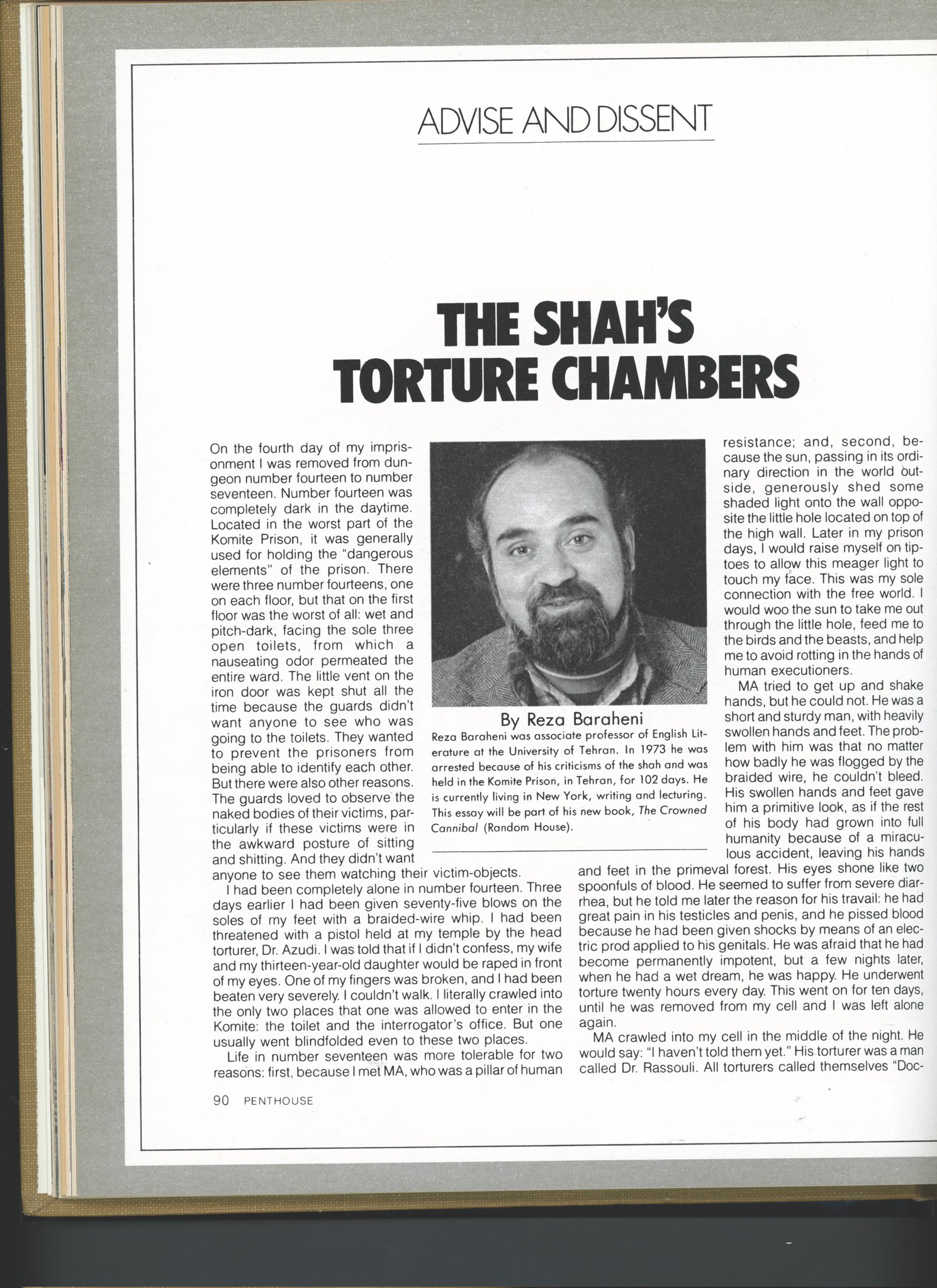 براهنی حتی پا را فراتر گذاشت و در فوریه ۱۹۷۷ میلادی مقاله‌ای را در مجله پورنوگرافی Penthouse پنت‌هاوس آمریکا با عنوان the Shah's Torture Chambers چاپ کرد و دوباره همان توهمات جنسی شکنجه را در آنجا بازگو کرد.